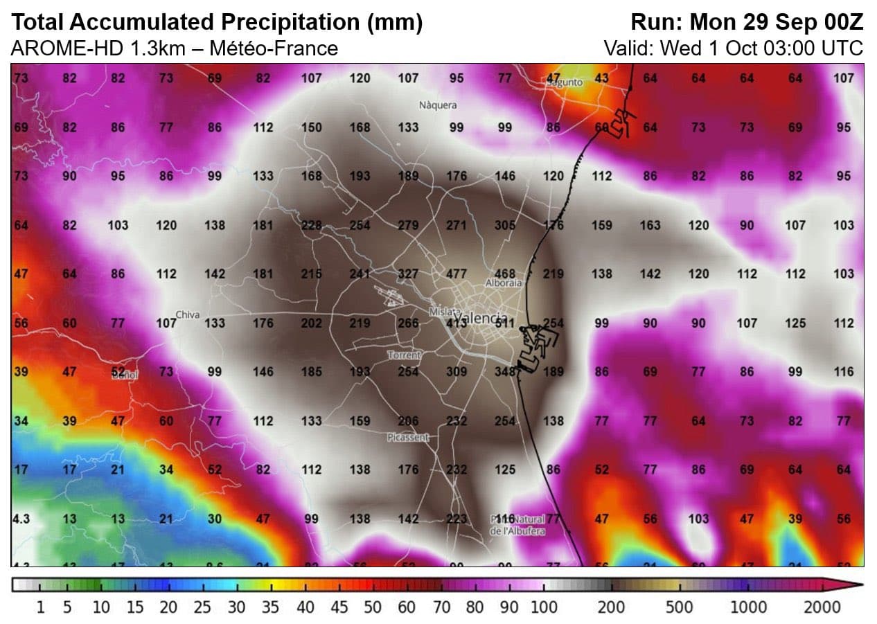 Cumuls de précipitations sur la région de Valence en Espagne d'ici le mercredi 1er octobre 2025 - Arome-HD