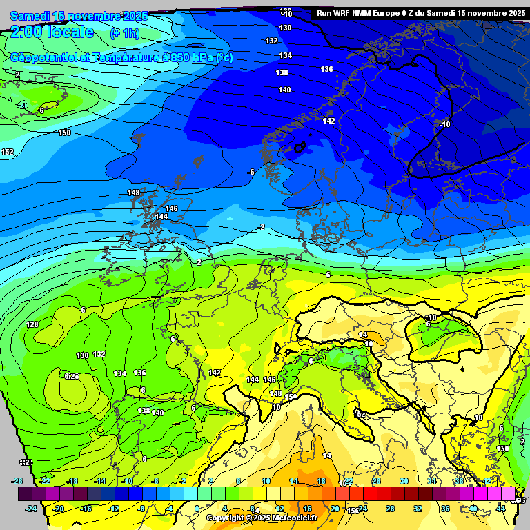 Progression de la descente froide polaire et évolution de la masse d'air à 850 hPa jusqu'à jeudi prochain - modèle météo WRF Meteociel