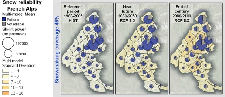 La modélisation ci-dessus est réalisée à partir d'un scénario de la poursuite du réchauffement à sa vitesse actuelle. Elle s'intéresse aux Alpes, massif le mieux loti en terme d'enneigement. La dimension des cercles correspond à la taille des domaines skiables par massifs et la portion bleutée des cercles évoque la part du domaine skiable praticable, pour la période 1986-2005 (à gauche) puis pour les modélisations de 2030-2050 (au centre) et 2080-2100 (à droite).