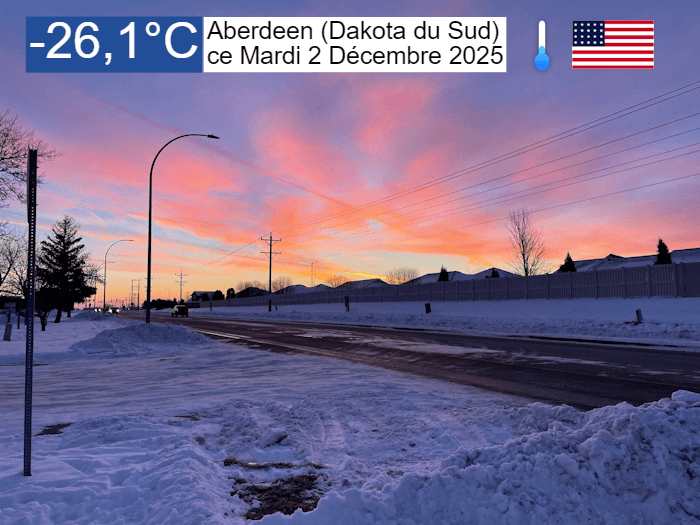 Même si le pic de froid reste à venir pour le Canada et le nord-est des USA, l'air polaire concerne déjà le nord de l'Amérique en ce début décembre. Ce matin du mardi 2 décembre 2025, les températures se sont enfoncées à des niveaux particulièrement froids entre le Canada et le nord des États-Unis. À Aberdeen dans le Dakota du Sud, le thermomètre affichait -26,1°C à l'aube ! Même si cette région d'Amérique est habituée au froid, cette valeur se situe tout de même 15°C en dessous des moyennes de saison !