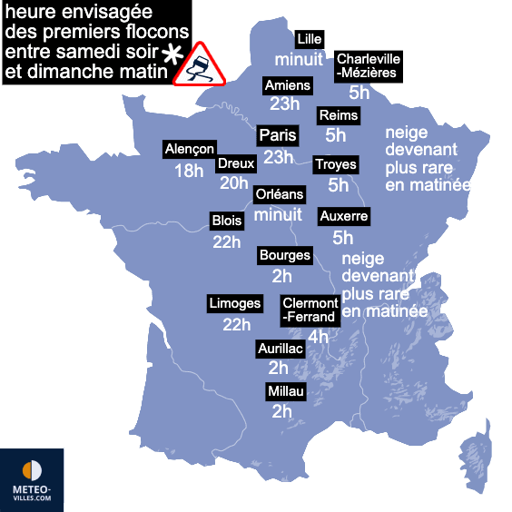 Le département de l’Orne sera probablement la première zone à connaître des chutes de neige samedi en début de soirée.  Par la suite, la zone de neige s’étendra progressivement à mesure que les précipitations progresseront dans l’air froid. Entre 20 heures et 22 heures, des chutes de neige sont prévues entre Dreux, Blois et Limoges. La neige aborderait ensuite l’Île-de-France et la Picardie par l’Ouest à partir de 22 heures