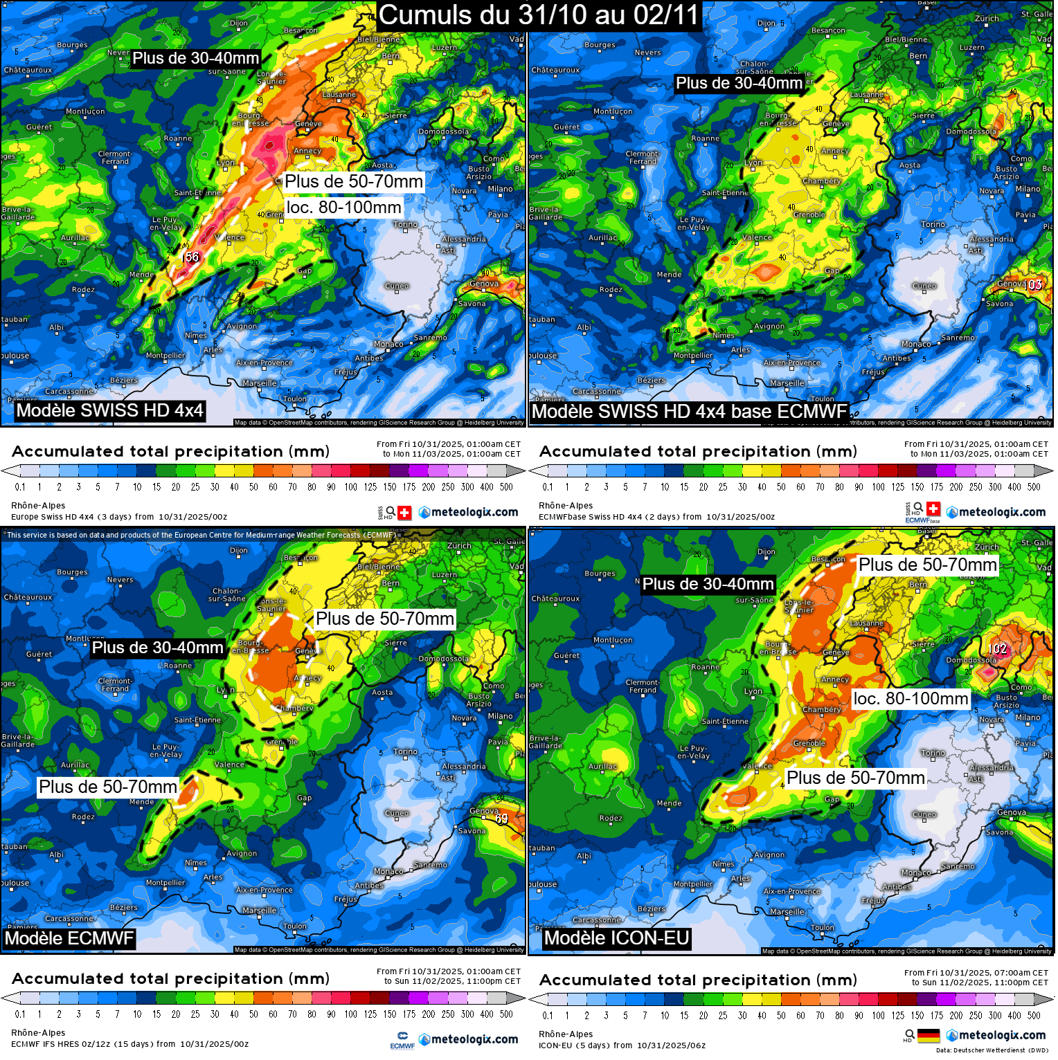 Différents cumuls de précipitations envisagés sur le centre-est de la France d'ici le dimanche 2 novembre au soir – Via meteologix
