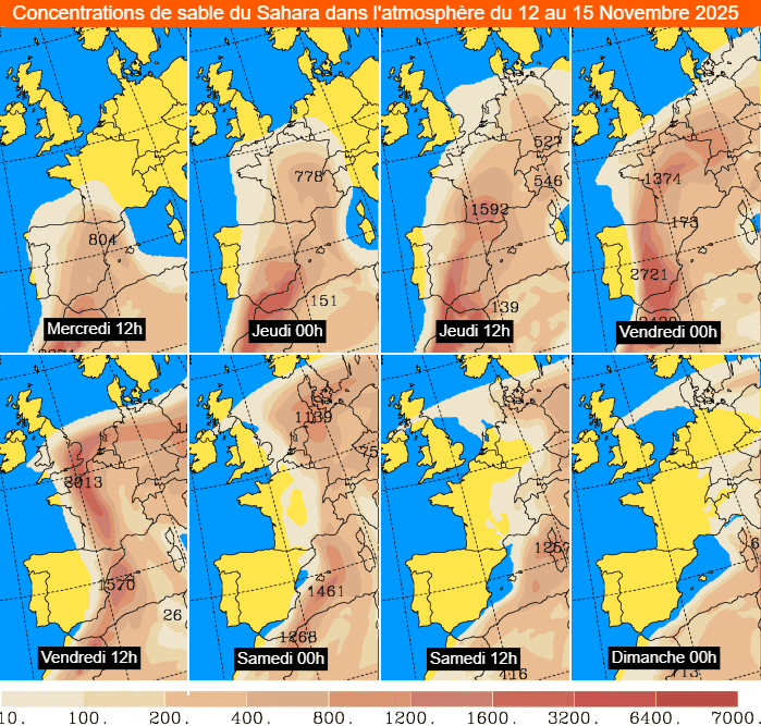 Ainsi, les premières poussières de sable saharien arriveront par les Pyrénées dès l'après-midi de ce mercredi 12 novembre 2025. Dans la nuit de mercredi à jeudi puis jeudi 13 novembre, elles survoleront la totalité de la France avec des concentrations passagèrement notables, notamment du sud-ouest vers le nord-est de la France. Ces poussières resteront présentes dans de nombreuses régions jusqu'au vendredi 14 novembre puis elles s'évacueront par les frontières de l'est le samedi 15 novembre.