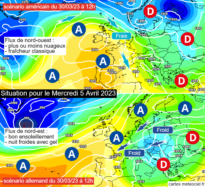 Scénarios des modèles américain et allemand pour le mercredi 5 avril 2023 - via meteociel.fr