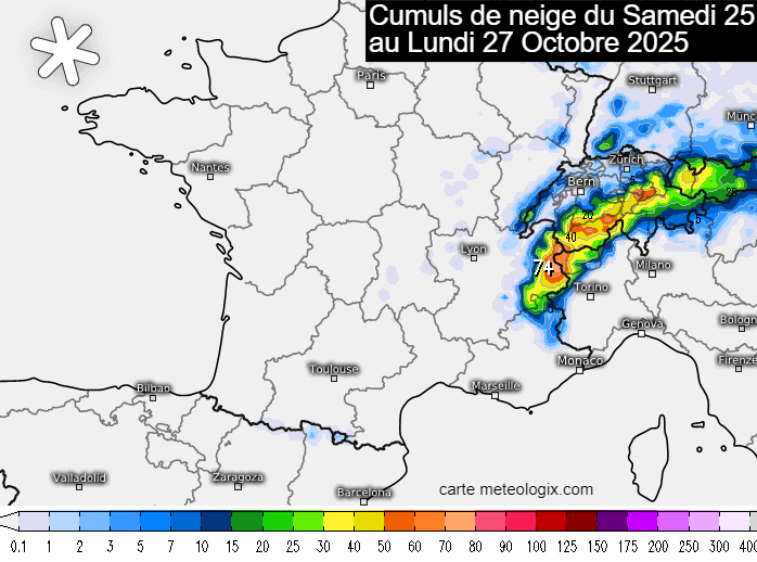Cumuls de neige prévus sur les reliefs du samedi 25 au lundi 27 octobre 2025 - meteologix.com
