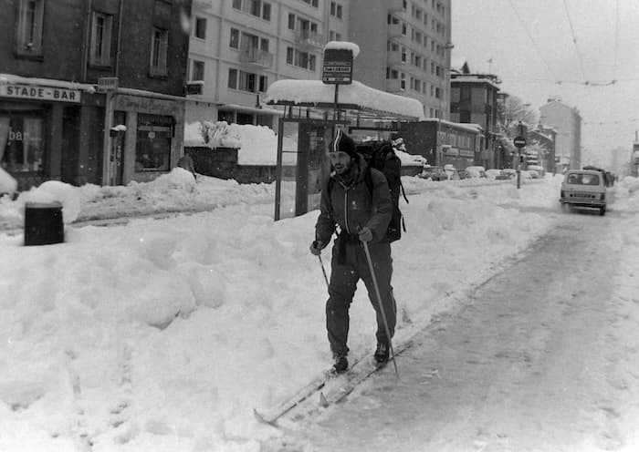 Dans les rues en pente, les voitures patinent, se mettent en travers ou restent simplement abandonnées là où elles se sont arrêtées. Beaucoup de Stéphanois choisissent la seule solution fiable : marcher… ou chausser des skis de fond pour traverser la ville. Des photos d’archives montrent ainsi un homme progressant à skis le long d’un arrêt de bus enseveli.