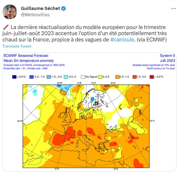 Ainsi, l'été 2023 est prévu comme chaud sur la France par les principaux modèles de prévisions saisonnières car les conditions atmosphériques se montreront favorables à des températures plus élevées que la moyenne durant cette période de l'année. Cela ne voudra donc pas dire que toutes les journées s'étendant de juin à août seront chaudes, mais seulement que les températures seront plus élevées que la moyenne sur cette période. Des coups de frais resteront possibles, mais ceux-ci devraient être bien moins nombreux que les coups de chauds, sinon les modélisations envisageraient des températures plus basses que la moyenne sur notre pays.